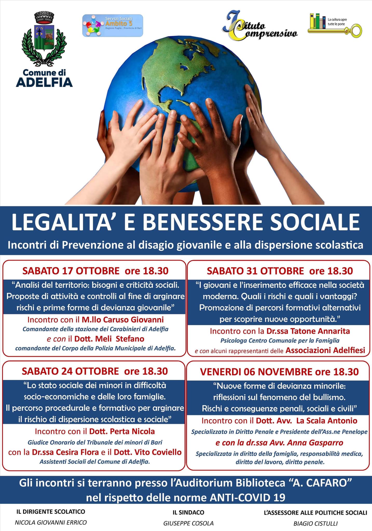 Una serie di incontri svolti nel 2020 in sinergia tra scuola-comune-genitori-forze dell’ordine-magistrati-avvocati-servizio sociale professionale-associazioni, per analizzare ed arginare il fenomeno del disagio giovanile e dispersione scolastica con i rischi e le conseguenze a cui vanno incontro i nostri ragazzi.